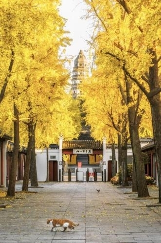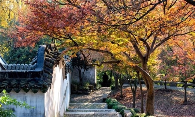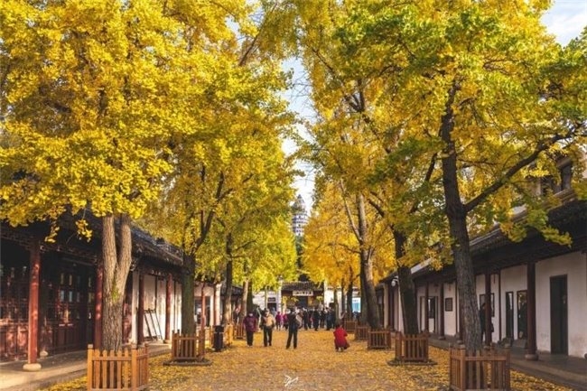 头山门位于虎丘山景区的南门入口,是进入虎丘的第一道标志性建筑,门额上题有“虎阜禅寺”,周边有多株银杏,秋季色彩从明黄渐变至金黄,枝干虬曲苍劲,仿佛“金蝶栖枝”。在清晨或傍晚,与阳光配合,可以蹲在门内,以牌匾为前景,拍摄牌匾与远处银杏,可以站在门外5米处,将银杏、“吴中第一山”牌匾、塔纳入画面,也可以在门内,用广角镜头捕捉“银杏叶+虎丘塔”的对称构图,都是秋日金黄景致,仿佛“古木守门”。