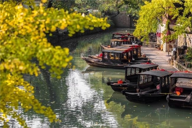 海涌桥位于虎丘山景区南侧,桥旁边有游船,正对着断梁殿。环山河水质清澈,西侧银杏与河边的船形成“棕-红-黄”的渐变色彩。叶片飘落在水中,微风拂过,水面波光粼粼,银杏倒影随波晃动。从海涌桥西侧取景,让银杏位于画面左侧,游船在右侧,留白部分水面,画面则十分灵动,充满诗意。