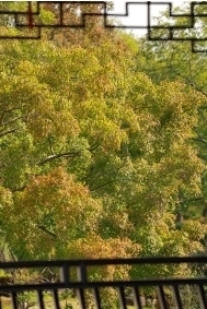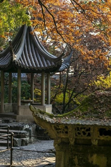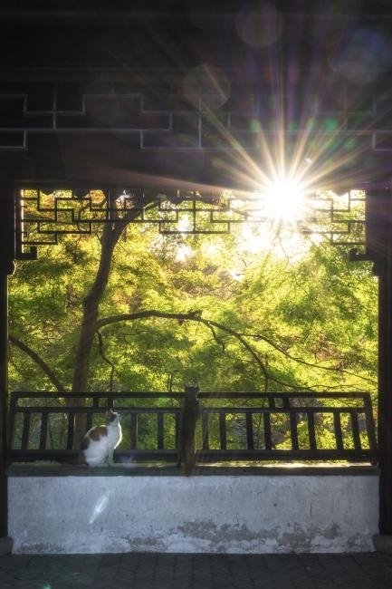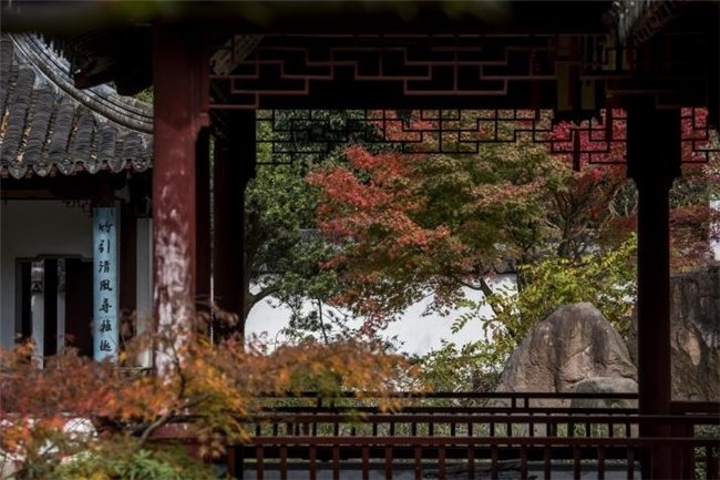 巢云廊,虎丘山的又一经典网红打卡点,用广角镜头或全景模式,站在走廊外面拍摄窗景或局部特写窗户,都能拍出明信片一般的画面。尤其当用侧逆光拍摄,可为红枫和假山披上一层金边,用相机的“点测光”功能对准中间的圆窗,可强化景深效果。