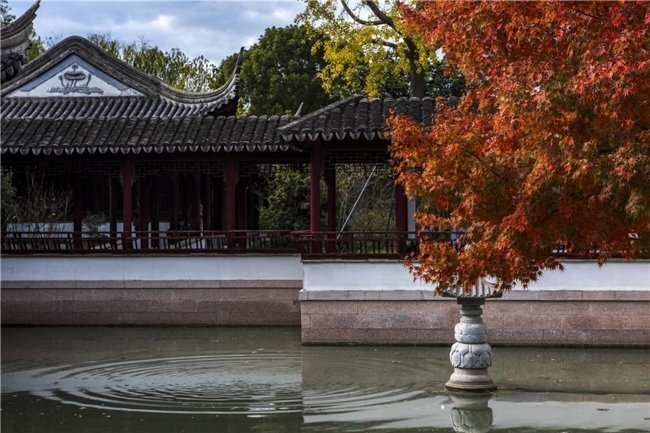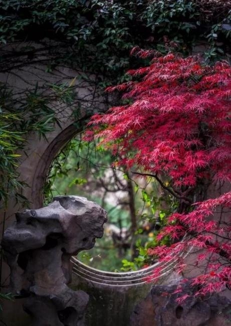 平远堂北侧的圆窗,可引发画面深处的遐想,左侧的假山和右侧的红枫相互呼应,是园林中秋日的经典画面。作为虎丘山的经典网红打卡点,无论是拍摄人像还是空镜,窗内还是窗外都能轻松出片。